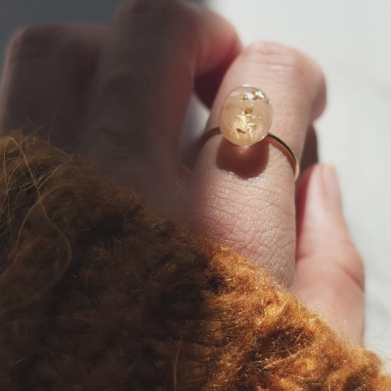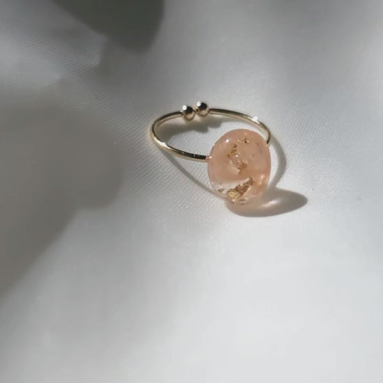 The HARU ring features a smooth oval orb, its hand-blended hue dancing between muted orange and creamy beige—like sunlight filtering through spring blossoms.