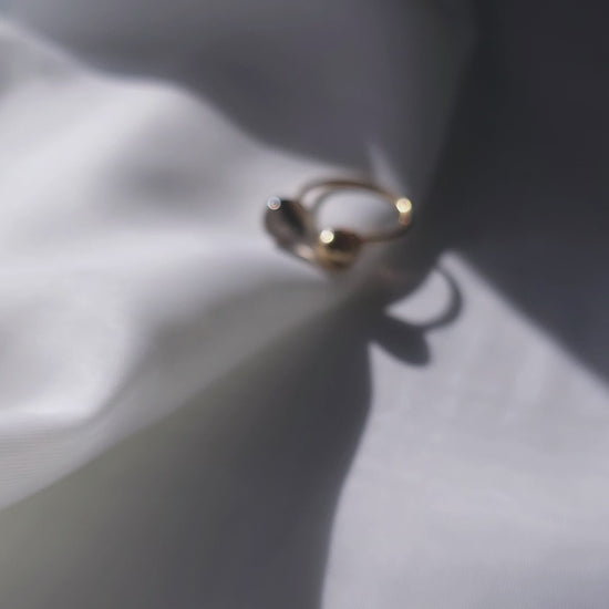 The double ring wraps gently around the finger, featuring the two orbs side by side. Its size can be adjusted by carefully and gently pushing or pulling the metal arm (NEVER the orb motifs) for a comfortable, secure fit.