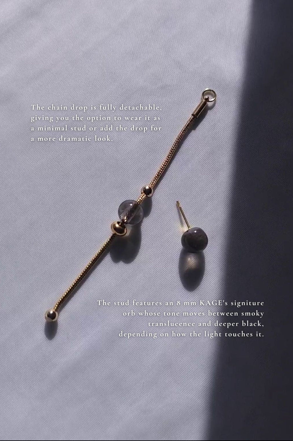 KAGE means “shadow” in Japanese, and this long drop carries that same quiet depth — shifting subtly with every change of light.