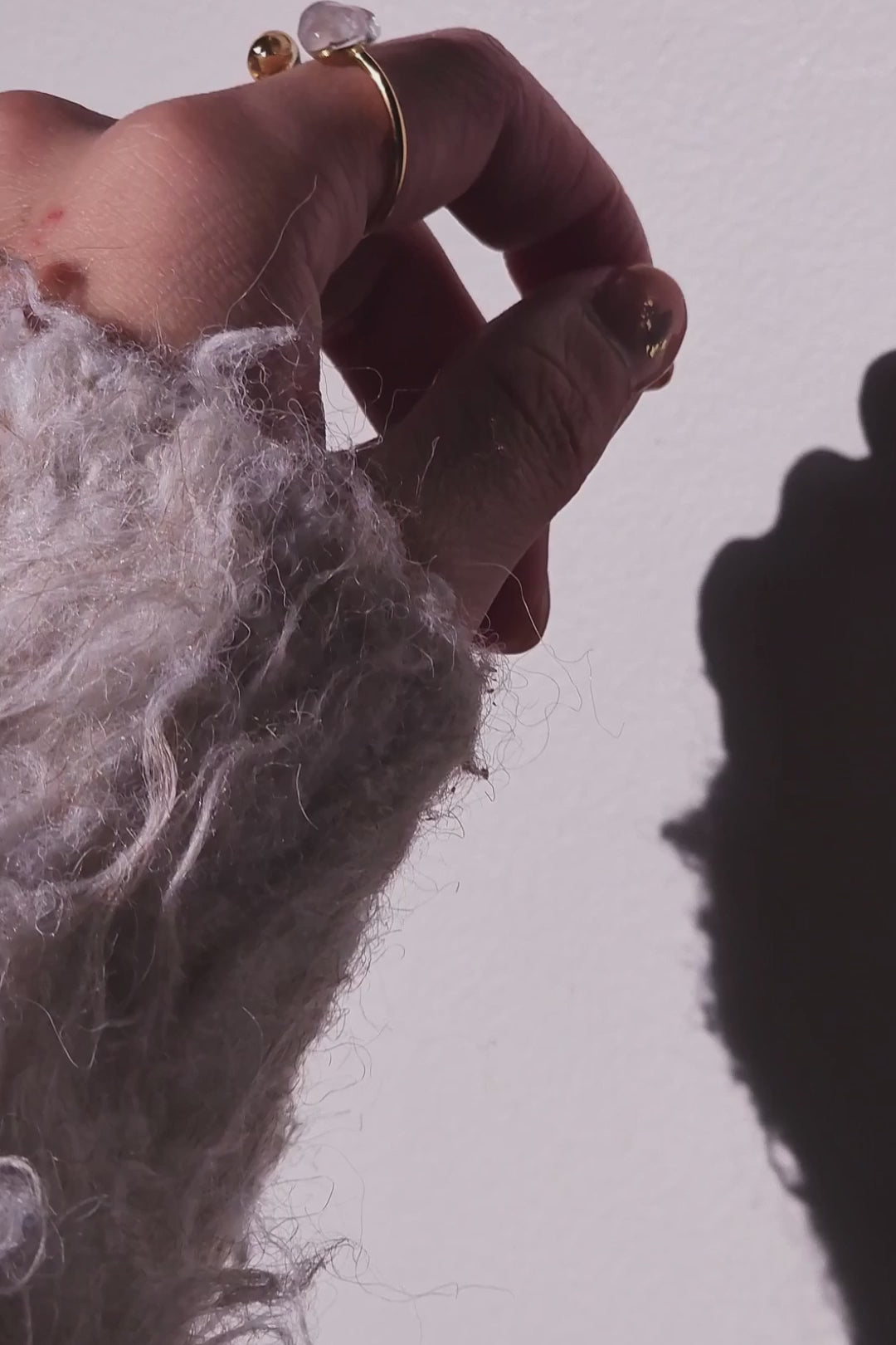 The open double ring wraps gently around the finger and can be adjusted for a comfortable, secure fit by carefully pushing or pulling the metal arm (NEVER the motifs themselves).