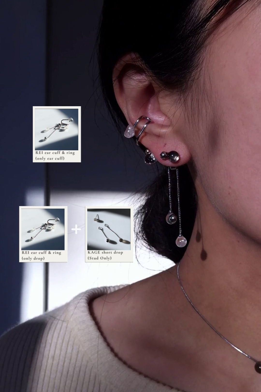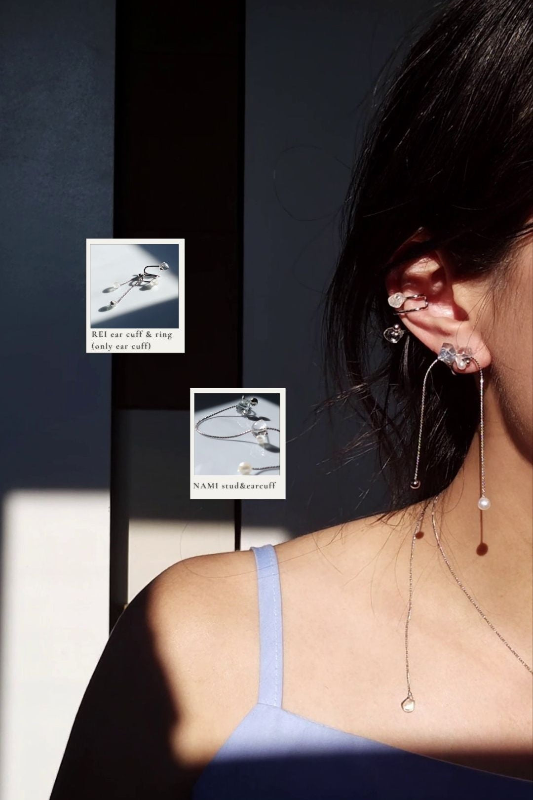 The double-band ear cuff features two contrasting hand-molded stones: one clear, like a dew, and the other in our signature “melting ice” stone, creating a quiet, delicate contrast.