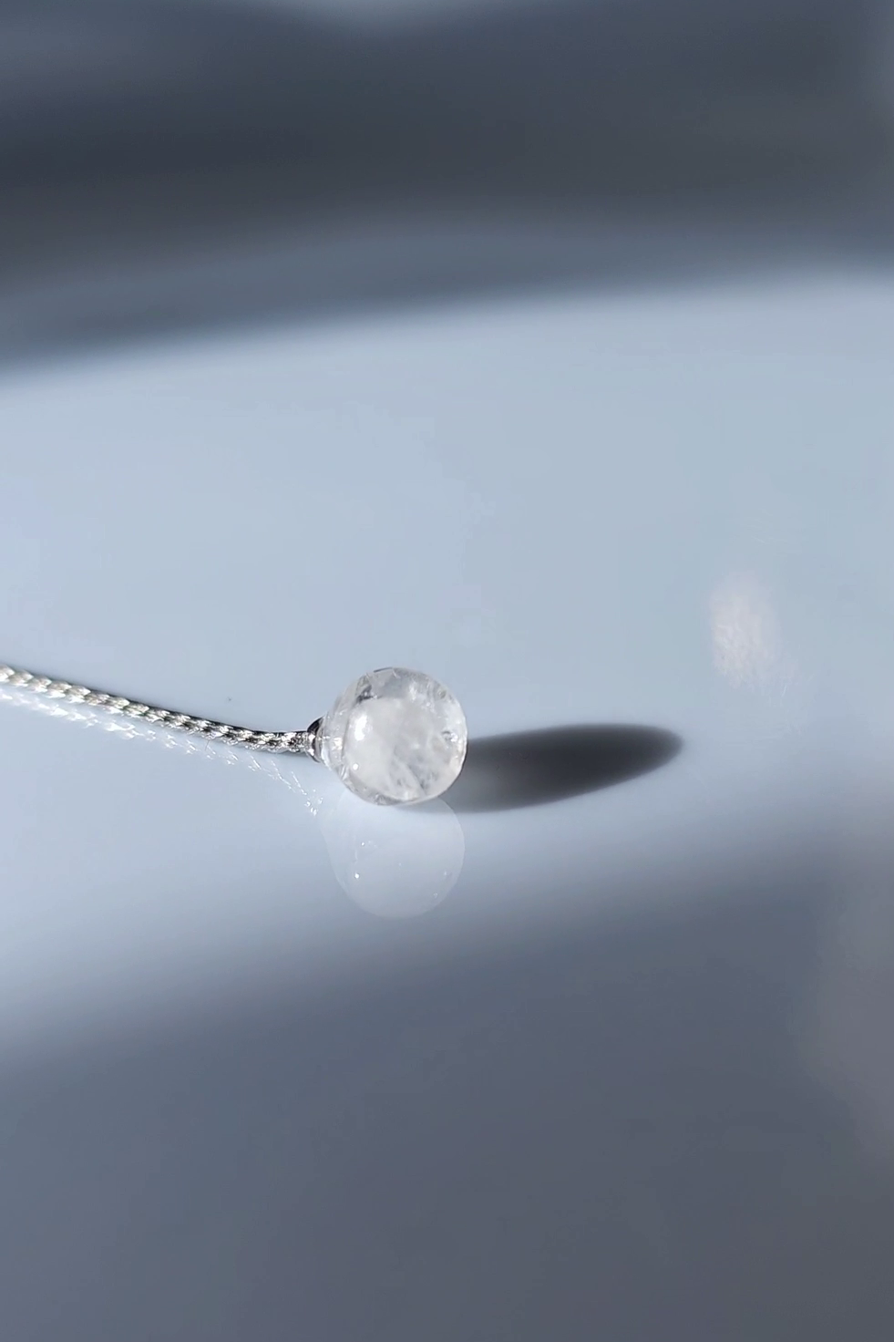It’s paired with a detachable chain drop finished with a 6 mm ice-like orb, with a movable silver orb.