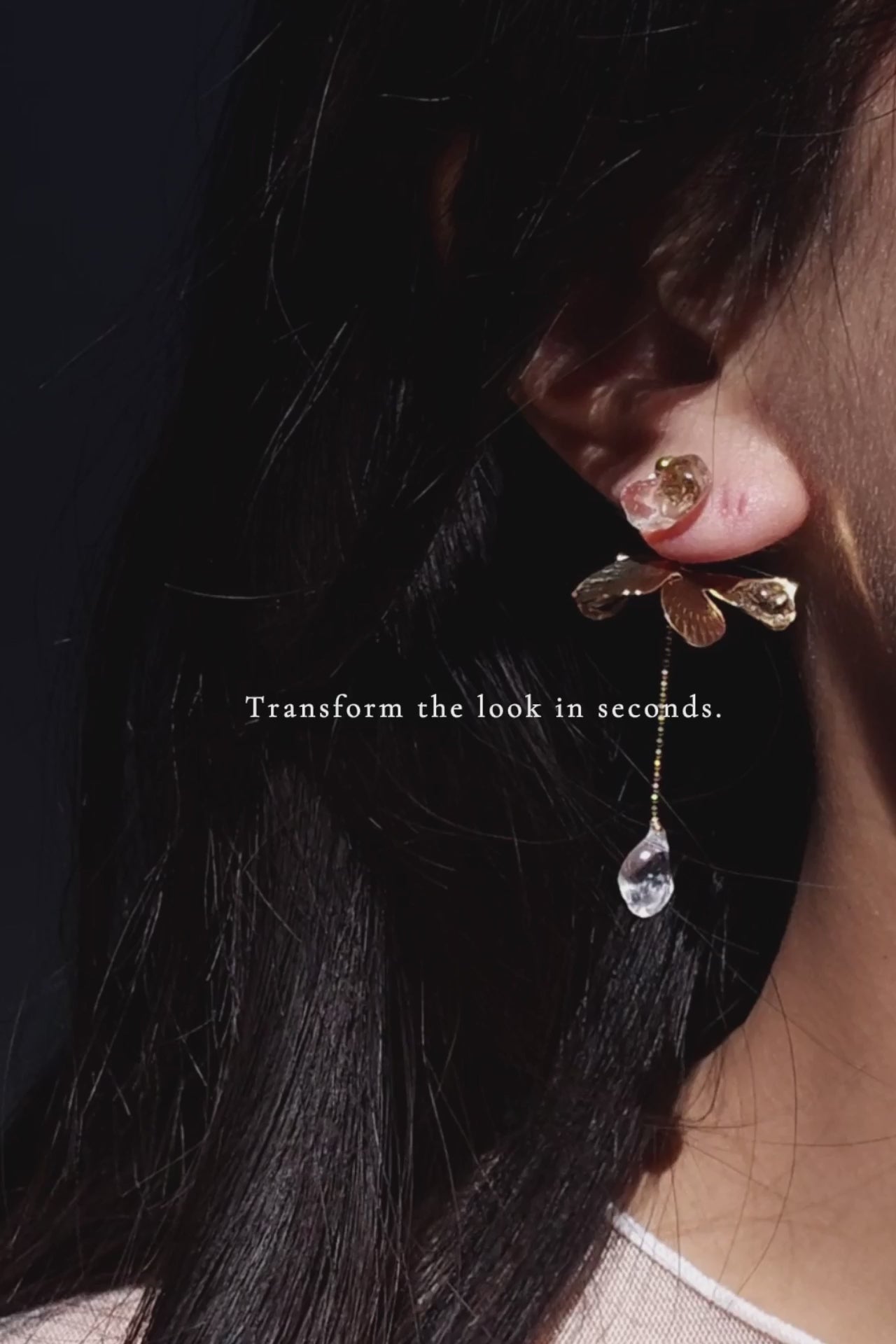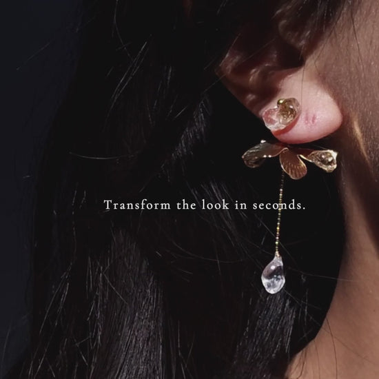 This short drop features a detachable chain drop, adorned with a soft gold petal and a hand-molded clear stone that catches the light with every step.